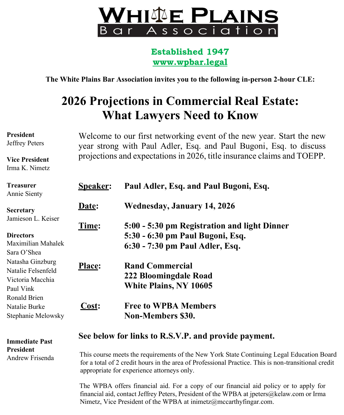 R.S.V.P.: E-mail the White Plains Bar Association at wpbarmembers@gmail.com or click here (an email with the subject line will automatically open).